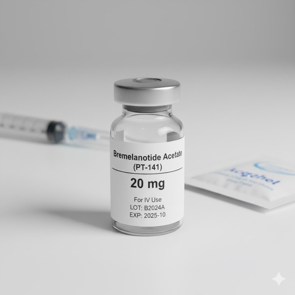 Bremelanotide (PT‑141) is a melanocortin receptor agonist that activates specific receptors in the brain responsible for sexual arousal and desire. Unlike erectile dysfunction medications, it does not act on the vascular system but stimulates neural pathways for central arousal. Subcutaneous injection allows the peptide to enter the bloodstream efficiently for rapid and effective response.