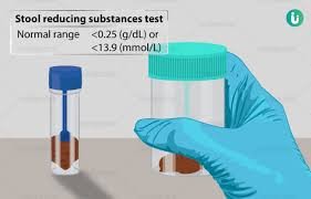 The test uses a Benedict’s reagent, which reacts with reducing sugars in the stool. A color change from blue to green, yellow, or red indicates the presence and concentration of unabsorbed sugars.